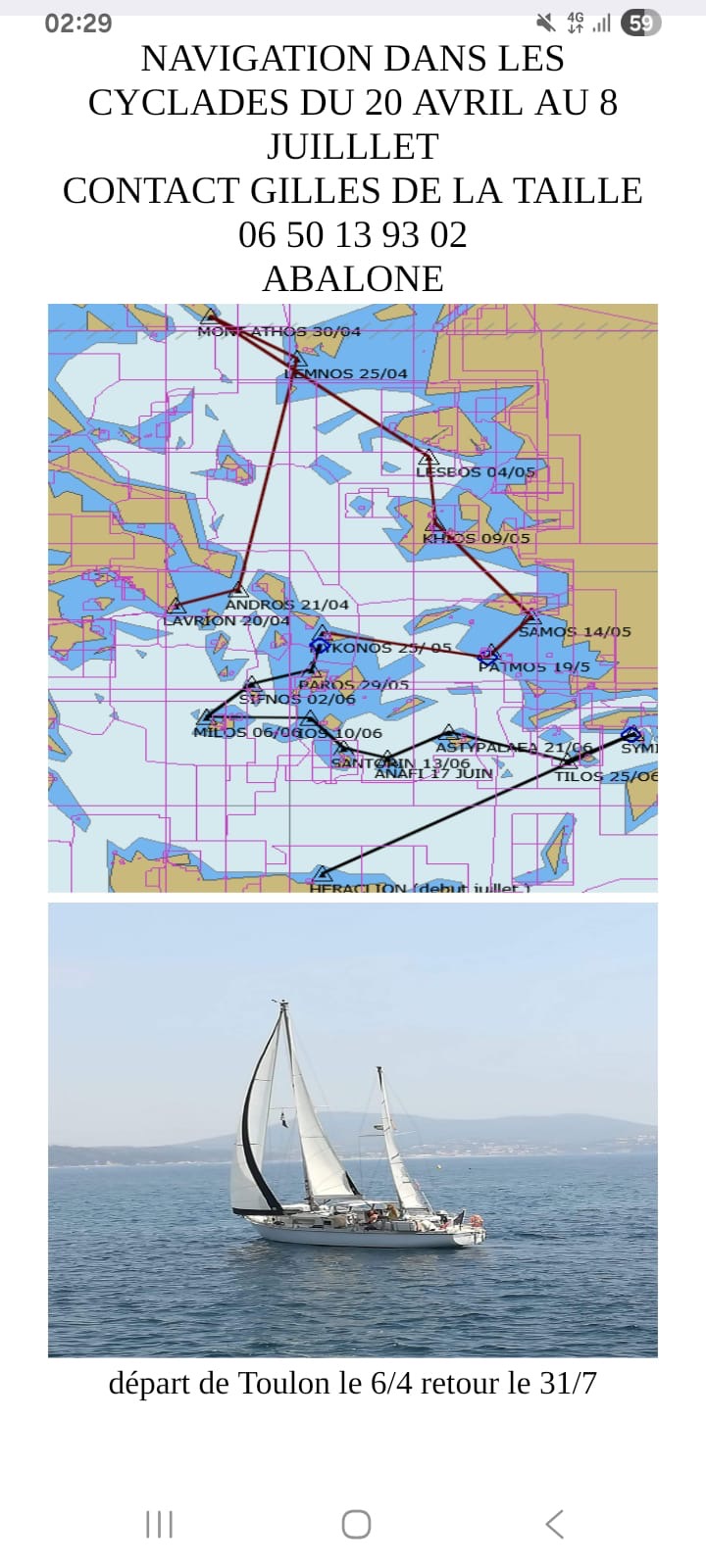 Après TERANGA (Daniel Achard) parti le 18 novembre dernier pour une nouvelle excursion transatlantique jusqu’aux Antilles, c’était en ce lundi de Pâques 2026 au tour du vénérable et presque cinquantenaire ABALONE (Gilles de la Taille) d’appareiller, mais dans la direction opposée, vers la Grèce, pour un périple dans les Cyclades. Retour prévu fin juillet.