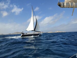 Les stagiaires ont rapidement découvert les réalités de la haute mer lors d’une navigation au portant de 40 nm jusqu’à Marseille. Des vents soutenus (20 à 27kts) et une mer croisée ont rendu l’étape particulièrement éprouvante et ont mis à rude épreuve les estomacs les plus solides.