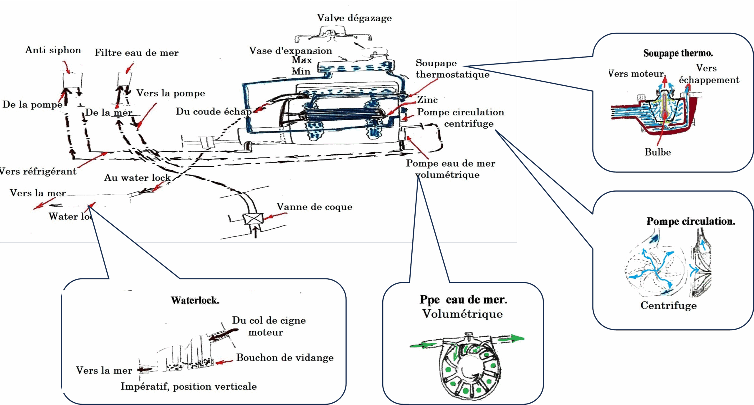 Éventuellement, par sécurité (oubli dans la précipitation), la vanne de circulation eau de mer moteur peut, au mouillage, rester ouverte (sécurité en cas d’appareillage d’urgence)