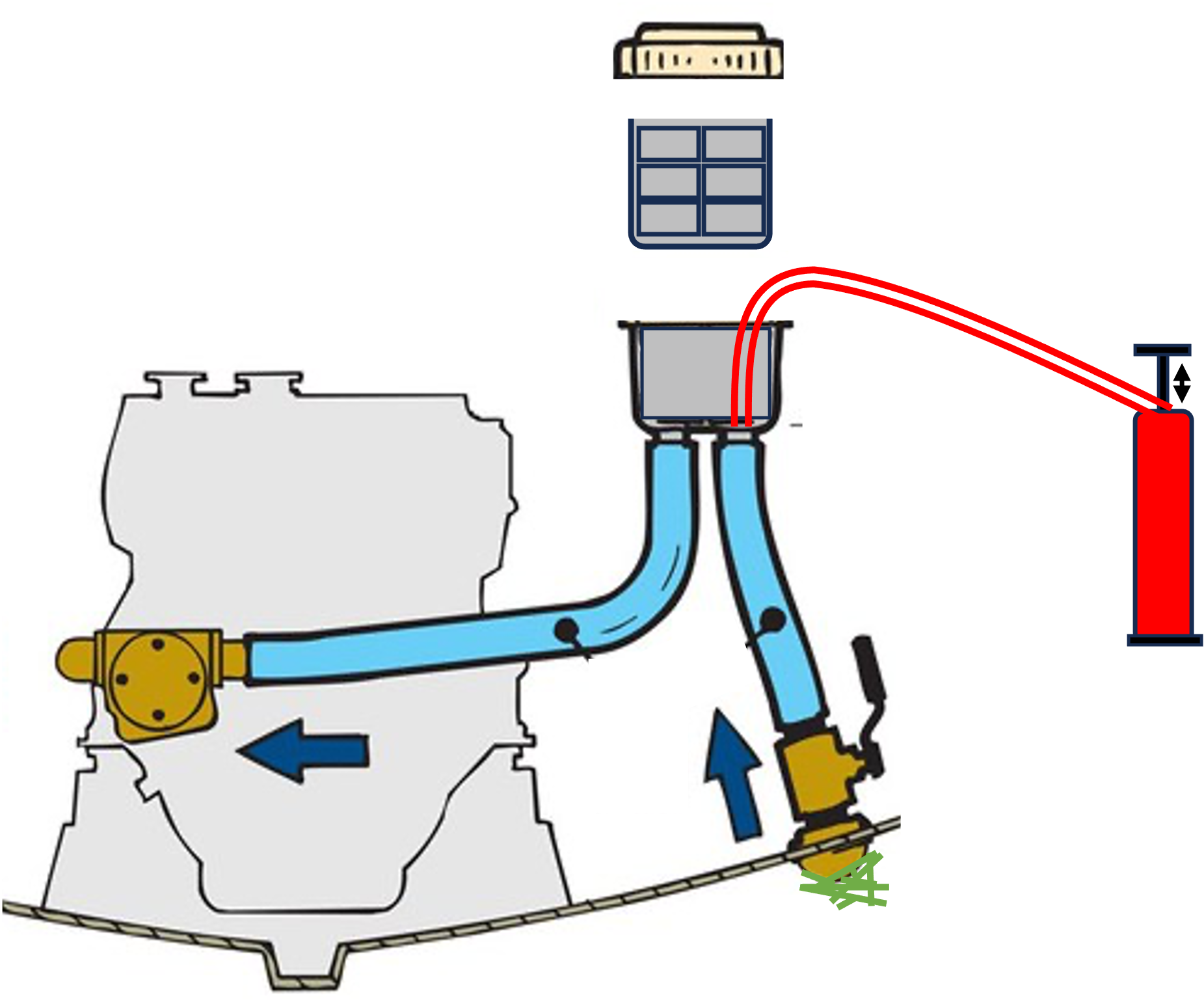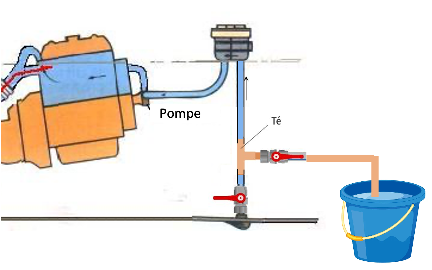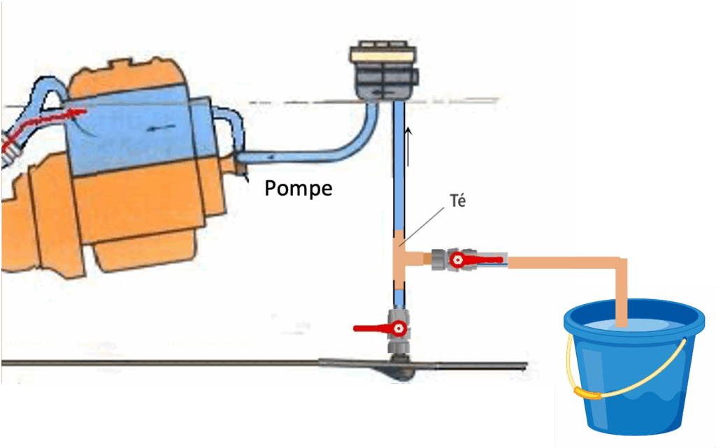Vanne de coque fermée, vanne quart de tour ouverte, c’est le contenu du seau qui est aspiré.