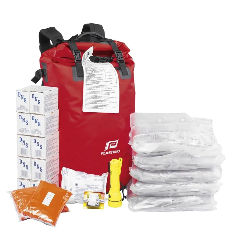 Révision tous les 3 ans pour la pyrotechnie et tous les 5 ans pour l’eau et les rations. Grab bag pour 6 personnes.
